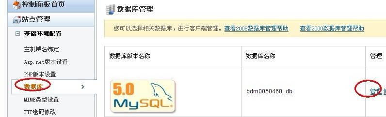 萬網(wǎng)空間控制面板,點擊控制面板左邊的,數(shù)據(jù)庫就會顯示右邊的,管理按鈕,