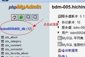 進入數(shù)據(jù)庫phpmyadmin管理界面后,點擊左邊的數(shù)據(jù)庫名稱如圖