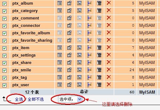 顯示所有表的時候,找到下面的一個(全選),然后點擊右邊的選中項:選擇刪除