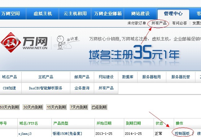1、進入我們網站管理中心-所有產品-找到主機的控制面板,如下圖