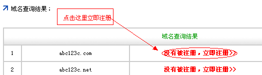第三步,系統(tǒng)會查詢此域名是否被注冊,如果沒有被其他用戶注冊,將顯示紅色連接“沒有被注冊,立即注冊”