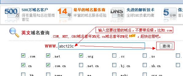第二步,在域名查詢那里輸入您想注冊的域名,比如您想注冊www.abc123c.om,那么就在輸入框里輸入abc123c 即可,點擊右邊的“查詢”按鈕