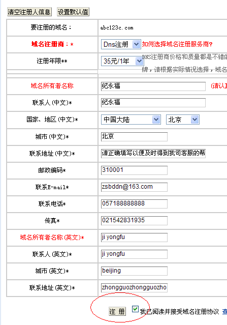 第四步,請認真填您的域名注冊信息,包括域名的所有人,郵箱,電話。其中域名所有人不宜修改,請認真填寫后點擊下面的,同意,并確認按鈕。