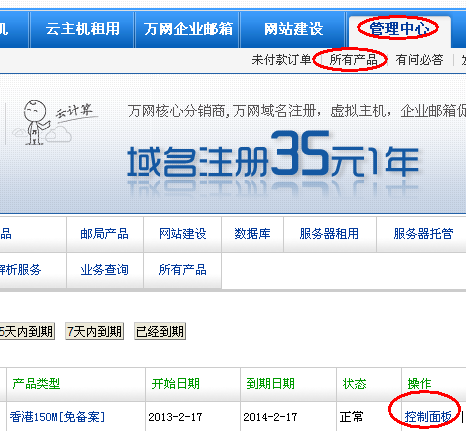 第一步,假設您已經登錄我們網站,請點擊,導航欄,管理中心-所有產品,然后會出來您的香港空間,然后點擊控制面板。
