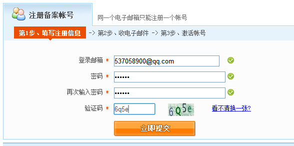 第二步,填寫備案郵箱帳號和密碼,并激活備案帳號,如圖