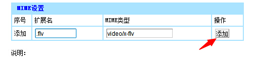 2, 擴展名添上”.FLV”,內容類型(MIME)添上"video/x-flv