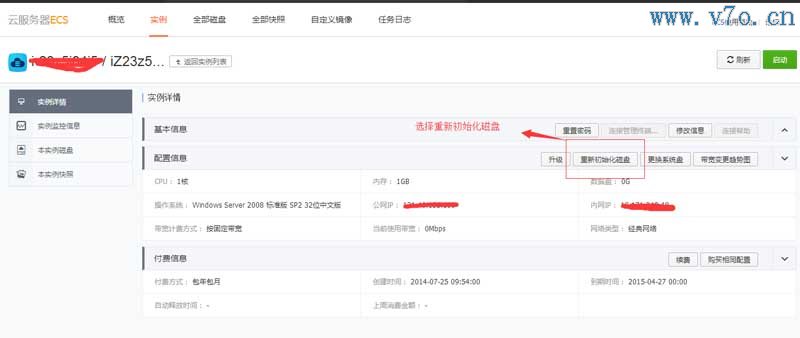 當服務器停止完成后,再點擊實例詳情,控制臺將會顯示重置或者重裝按鈕,如下圖。