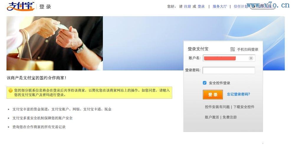 第三步:會(huì)跳轉(zhuǎn)至支付寶登陸頁面,輸入支付寶帳號(hào)及密碼