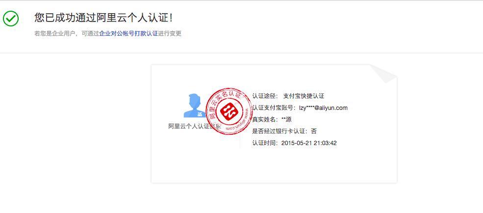 備注: 如果您的支付寶帳號(hào)經(jīng)過了個(gè)人實(shí)名認(rèn)證,將會(huì)完成阿里云個(gè)人實(shí)名認(rèn)證;如果您的支付寶帳號(hào)經(jīng)過了企業(yè)實(shí)名認(rèn)證,將會(huì)完成阿里云企業(yè)實(shí)名認(rèn)證;如果您的支付寶帳號(hào)未進(jìn)行過認(rèn)證,則會(huì)提醒認(rèn)證失敗,您需要在支付寶完成認(rèn)證后,再登陸阿里云進(jìn)行支付寶認(rèn)證。