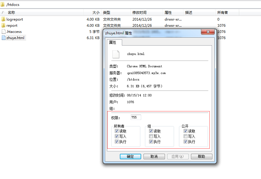 檢查htdocs以及此文件下的網站首頁文件權限是否正確,可以通過ftp連接之后找到需要檢查的文件夾或者文件,右鍵點擊選擇屬性即可查看和修改
