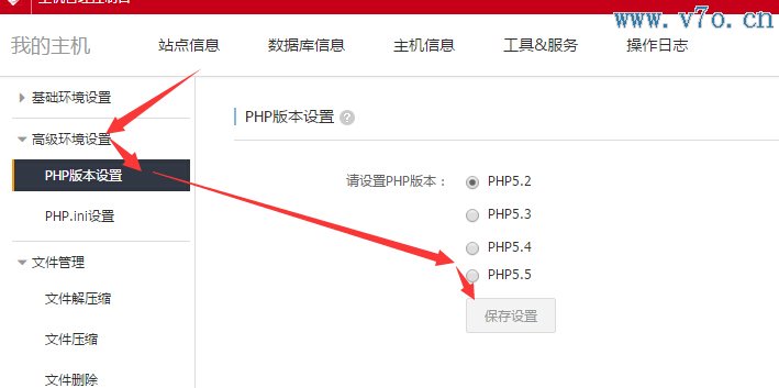 故障二:php版本不對導致,比如我們的程序是php5.3,空間默認是5.2,所以我們需要通過控制面板將php版本設置成相應的,目前