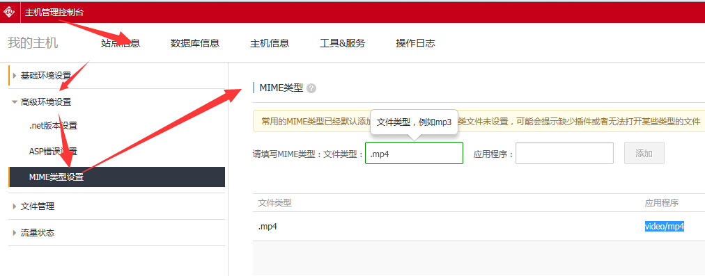 默認情況下空間可能無法支持mp4/flv格式的視頻播放,我們需要通過MIME方式設置,讓主機支持此類格式,然后就能解決無法播放視頻的原因,流程如下: