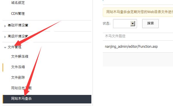 “網站木馬查殺”與每臺虛擬主機是綁定關系,購買了該服務的虛擬主機,在其虛擬主機的控制臺-文件管理下有“網站木馬查殺”的功能目錄,點擊進入可查看到當前虛擬主機是否存在木馬文件,如下圖。