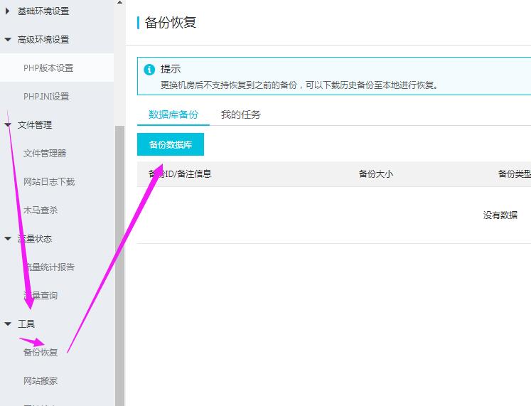 第1步,登錄萬網主機控制面板,找到工具-備份數據庫,如圖