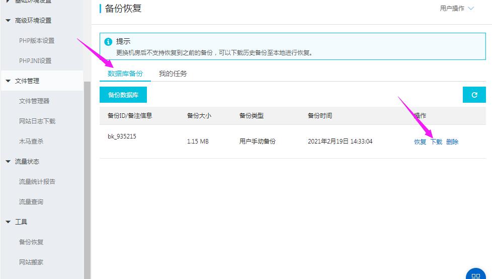 備份成功后,找到數據庫備份按鈕-點擊下載,如果下載不了,建議換個瀏覽器測試