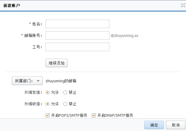2、把員工姓名帳號填寫,選擇員工相關部門,設置對外收發郵件是否限制,并且可對此新建賬戶設置設置是否開啟客戶端的POP3/IMAP/SMTP服務,以及“能否在通訊錄共享”此員工賬號地址。