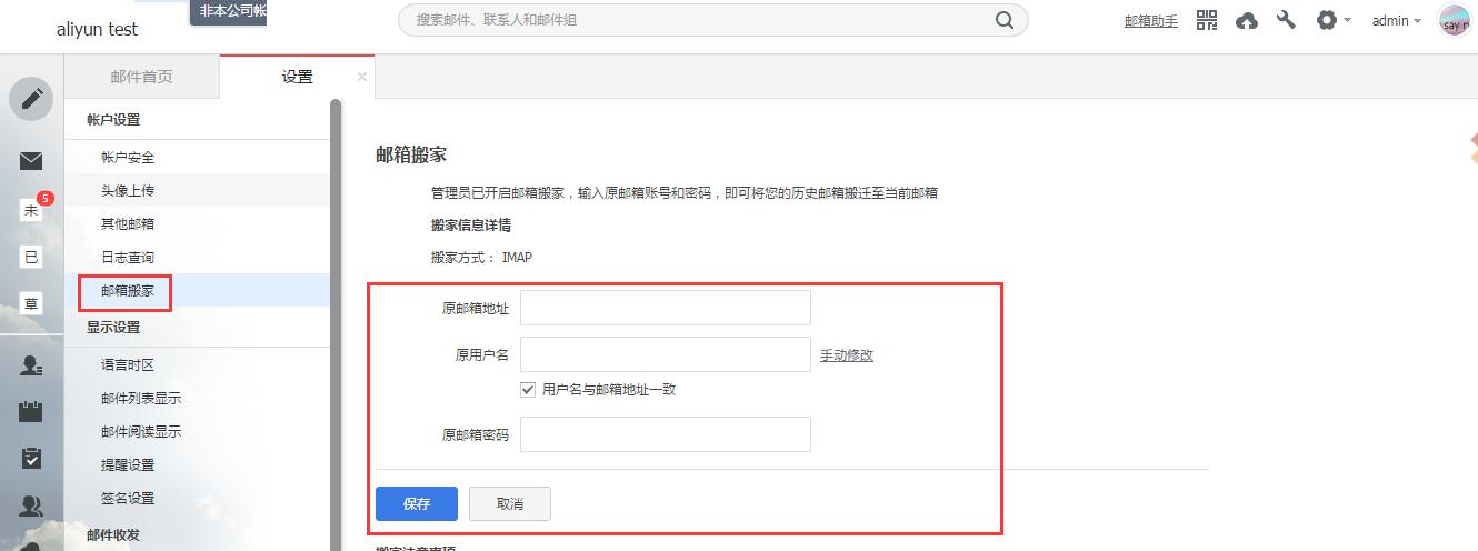 如果搬家的域與當(dāng)前域名不相同,由于非對(duì)應(yīng)關(guān)系,需要引導(dǎo)用戶登錄 Webmail 單擊右上角設(shè)置 > 帳戶設(shè)置 > 郵件搬家 > 輸入原系統(tǒng)對(duì)應(yīng)要搬家?guī)ぬ?hào)的郵件地址(用戶名)與密碼 > 保存 > 開(kāi)啟帳號(hào)郵件搬家。
