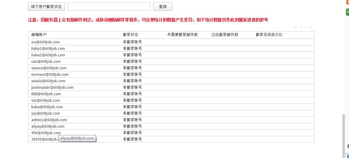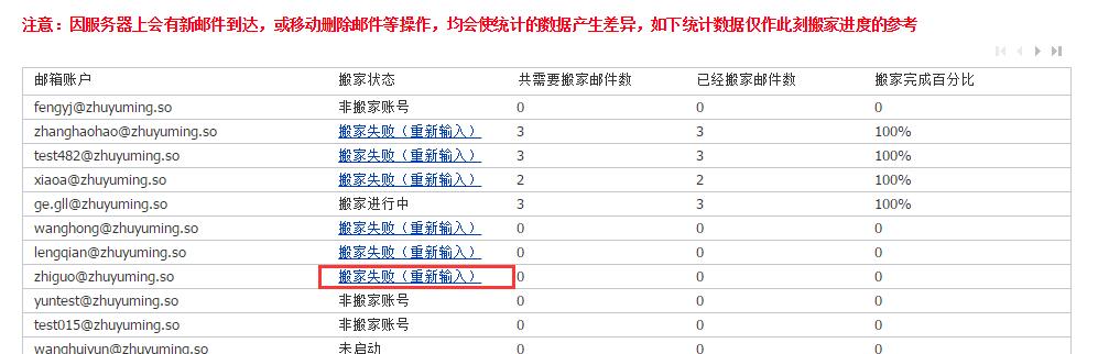 子帳號(hào)登錄網(wǎng)頁(yè)開(kāi)啟搬家的時(shí)間,以及搬家進(jìn)展(注意:搬家郵件數(shù)只是打開(kāi)當(dāng)前對(duì)方服務(wù)器返回給我們的郵件數(shù),極有可能由于對(duì)方服務(wù)器策略限制,輸出的數(shù)據(jù)存在不準(zhǔn)確的情況,具體數(shù)據(jù)最好是登錄原服務(wù)器查看郵件量,此統(tǒng)計(jì)僅做參考)。