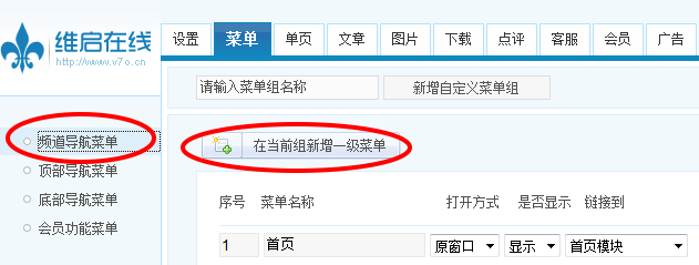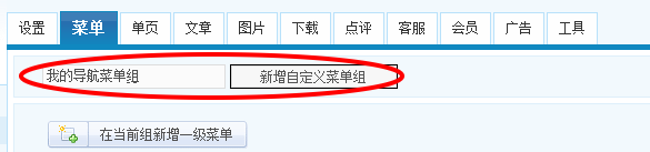 先在左側(cè)選擇一個菜單組,右側(cè)顯示該組導(dǎo)航菜單;按“在當前分組添加一級菜單”,然后在下面新增的菜單項目里修改名稱和鏈接指向,鏈接指向可以是各模塊的首頁或指定任何外部或內(nèi)部網(wǎng)址。