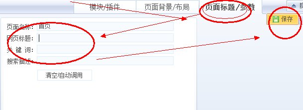 第三步,點(diǎn)擊“頁(yè)面標(biāo)題/參數(shù)",然后分別設(shè)置頁(yè)面名稱,網(wǎng)站標(biāo)題,關(guān)鍵詞,描述等信息。