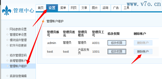 [功能位置]  登錄網站管理系統→點擊設置→管理帳戶維護