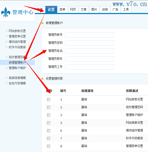 [功能位置]  登錄網站管理系統→點擊設置→新增管理帳號
