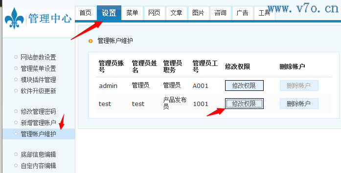 [功能說明]  找到需要修改的管理員,點擊“修改權限”按鈕,修改信息及權限,點擊“修改”按鈕完成修改。