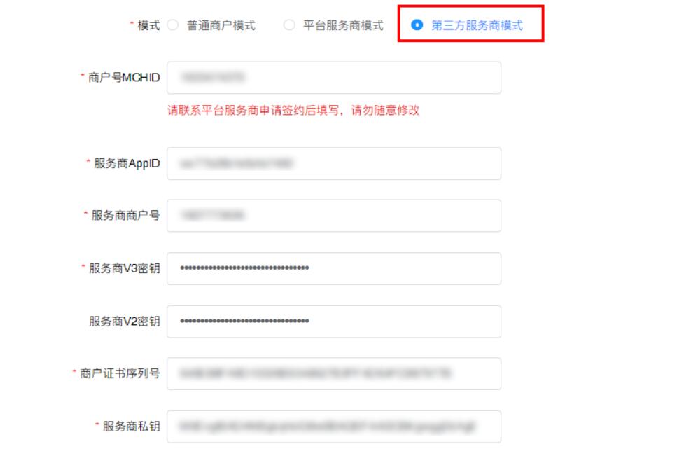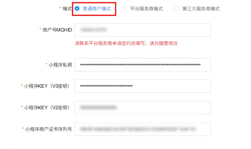 模式分為:普通商戶模式,平臺(tái)服務(wù)商模式,第三方服務(wù)商模式,填寫完畢后確認(rèn)保存即可(此處有度科技工作人員會(huì)協(xié)助填寫配置)